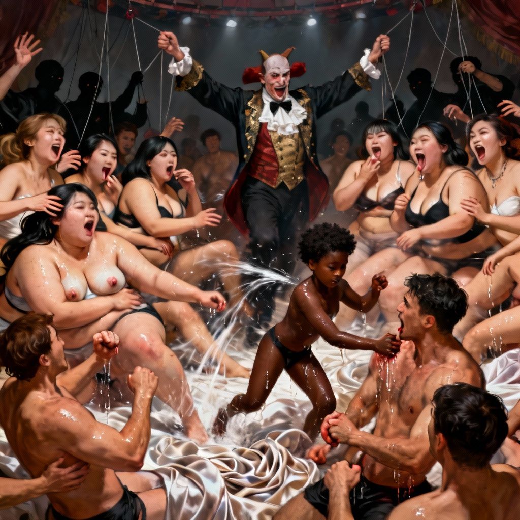 The escalations build, rivalries boil over into feverish collaborations— sigmasian and lau__1 merging streams for a toy-tossing extravaganza, kissing33 and mode_bad dueling with ever-larger artifacts until the chat explodes in tip avalanches. Pacho_stormie absorbs loving_ladies into a mega-group, absorbing skinny_candy18's ebony fire for a multicultural meltdown. I'm laughing maniacally now, self-mocking my own descent: "Look at me, the gonzo hack, jotting notes while the world warps— pass the caffeine, or better yet, a lobotomy!" Black comedy creeps in as performers "die" on screen in orgasmic apocalypses, only to resurrect for more, absurd riffs on pop refs like Lynch's red rooms but with dildos instead of curtains.