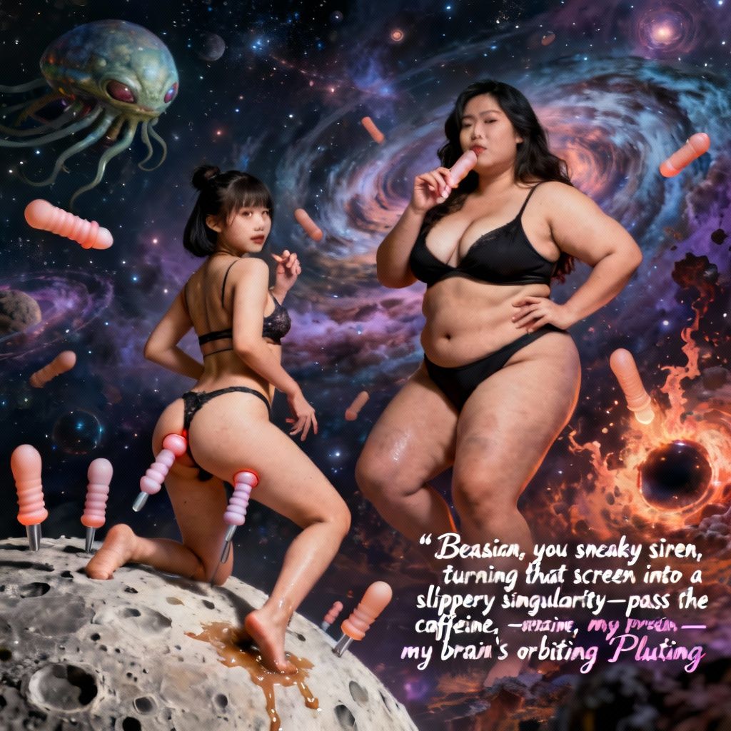 Shifting gears to the cosmic chaos crew, where Asian dynamos like sigmasian and baeasian are whipping up whirlpools of interdimensional insanity, petite busty forces of nature turning fetishes into feverish follies. Sigmasian drops in organically, ass posed like a lunar landing gone wrong, dildos inserting like alien probes scanning for secrets, her cum-on-ass finales feeling like black comedy punches to the gut. But baeasian ain't having it—she's the bi busty BBW rival, starting with bondage poses that escalate to large dildo invasions, their storylines crossing in my delirium as sigmasian's fingering frenzies meet baeasian's cock-sucking cyclones, building to a group dynamic where they're teaming up against the Latina earthly eruptions, a pun-filled punani war where metaphors spiral from culinary delights (dildos as forbidden fruits) to galactic gales (pussies as black holes sucking in sanity). I catch myself in a chatty aside, "Baeasian, you sneaky siren, turning that screen into a slippery singularity—pass the caffeine, my brain's orbiting Pluto!"