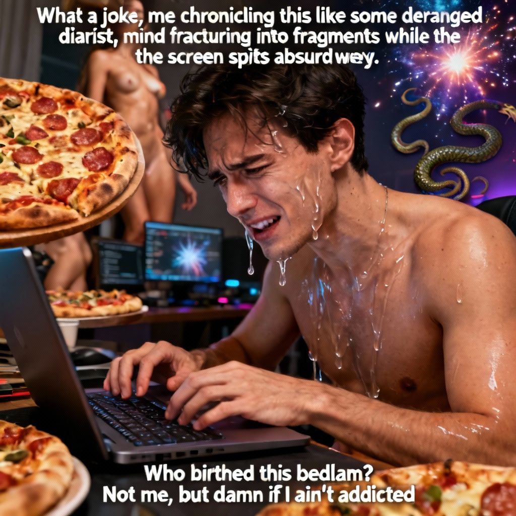 Me? I'm melting down, self-mocking as I type: "What a joke, me chronicling this like some deranged diarist, mind fracturing into fragments while the screen spits absurd riffs of black comedy." Metaphors? Started foodie with pizza-nude feasts, went galactic with squirting supernovas, ended apocalyptic with digital doomsdays where forbidden gadgets became enchanted engines of ecstasy, serpentine swallows sending reality packing. Rivalries peaked in imagined crossovers—SSWEETSIINN vs. nikita_mike in a squirting standoff, ravyn_nyx allying with CouplexGoals against Anal_Big_Cum's oral onslaughts, all while the narrator—that's me—rants rhetorical: "Who birthed this bedlam? Not me, but damn if I ain't addicted."