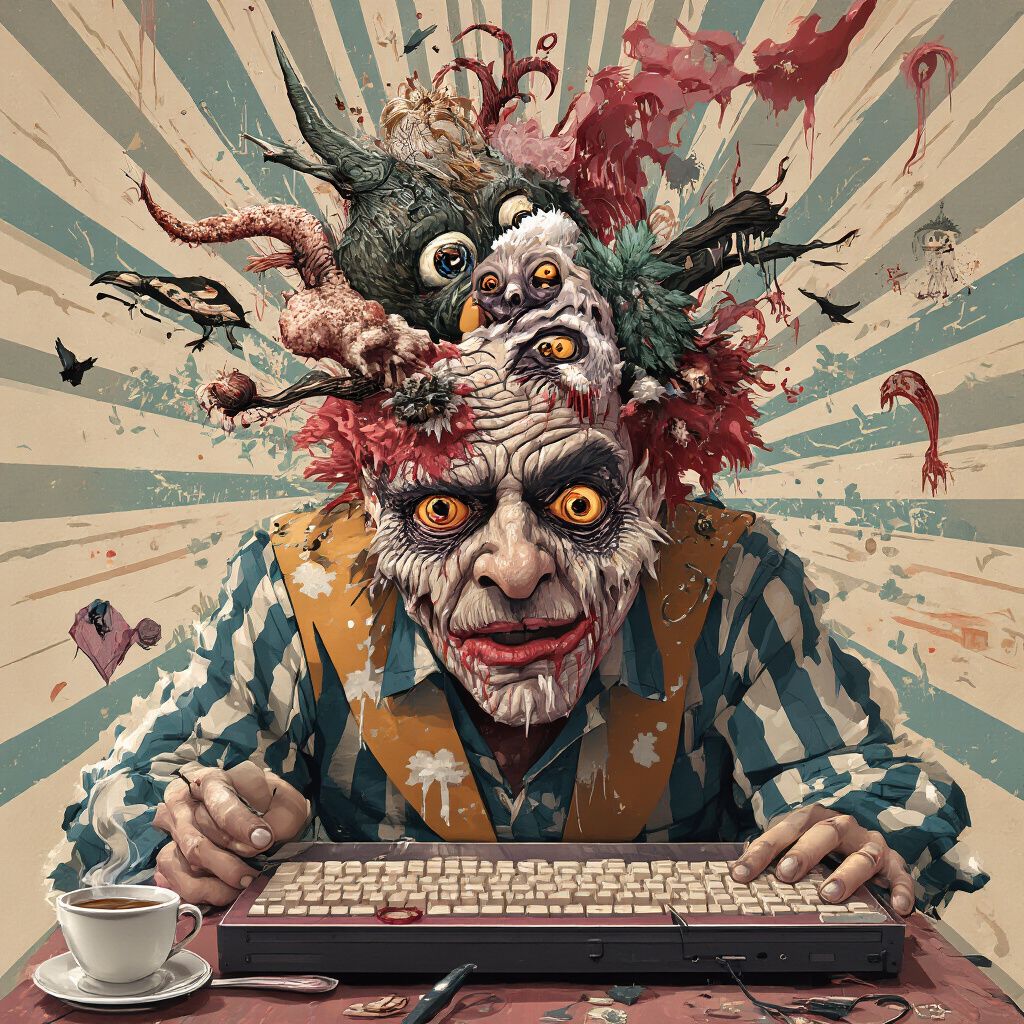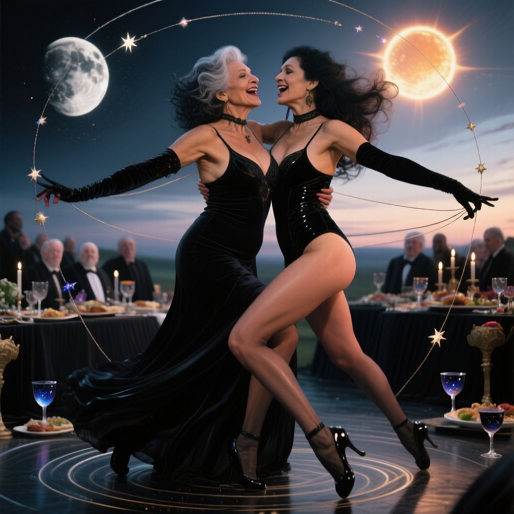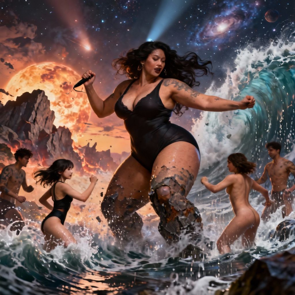I'm unraveling, dear readers—my coffee's cold, my laughs turning to manic cackles. Rhetorical outburst incoming: "Why stop at digital doomsday when we can drag in the whole damn cosmos?" The narratives weave tighter, performers circling back like sharks in chummed waters. Sultry and Lusty fuse in a late-hour lunacy, their volcanic vibes meeting lunar longings in a crossover that births bastard beasts—enchanted eruptions under moonlight madness. Naughty, ever the instigator, zaps in with her nebula nonsense, turning the trio into a theme-group terror: elders of ecstasy versus youthful yahoos.