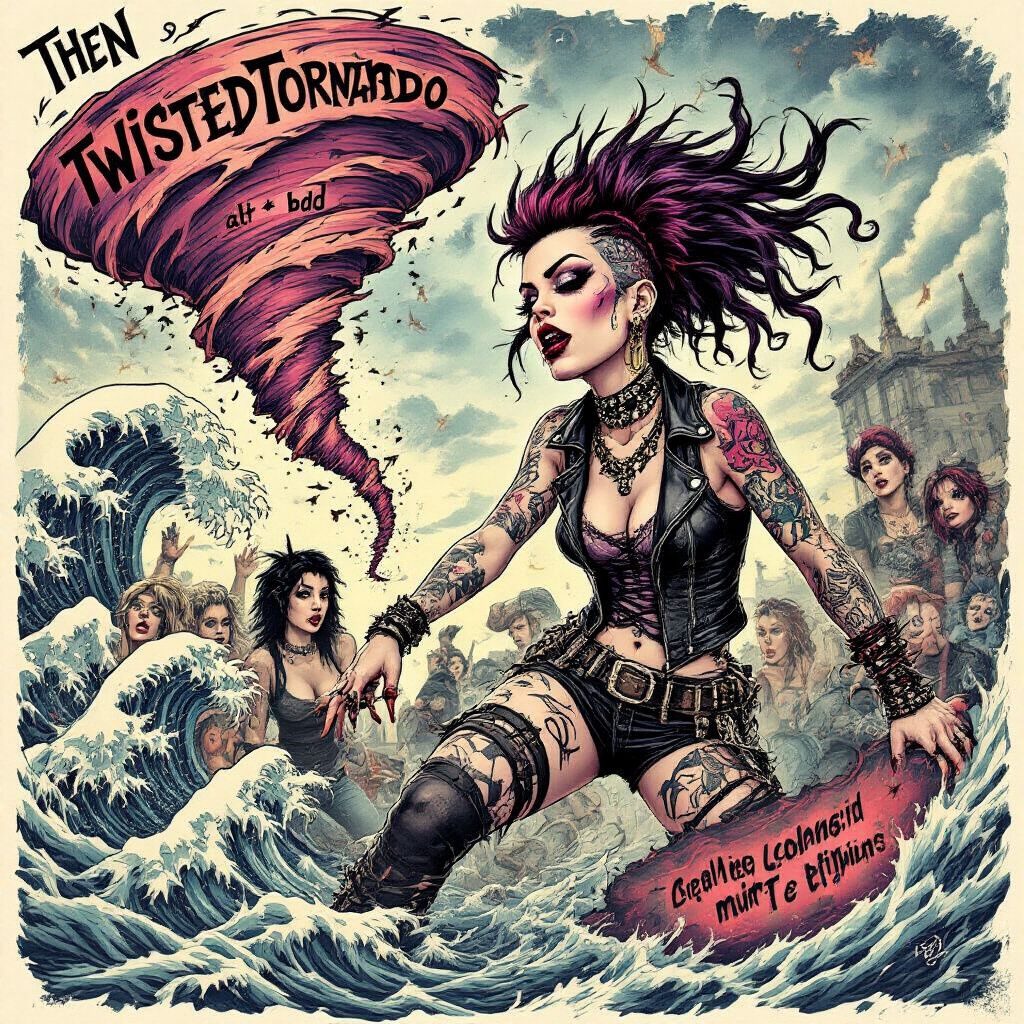 Then, because the universe loves a curveball, in drops TwistedTornado, a tattooed temptress with a punk edge, mid-twenties white girl gone wild, tags screaming "alt" and "bdsm" reimagined as tornadoes of twisted temptations. She tornadoes into the group, sparking crossovers that turn the Cosmic Chaos Crew into a full-blown catastrophe collective. Rivalries reignite: Twisted accuses Petite of "stealing her spin," leading to a whirlwind war where petite tsunamis meet tattooed tempests, metaphors spiraling from windy whispers to hurricane hors d'oeuvres served on platters of peril.